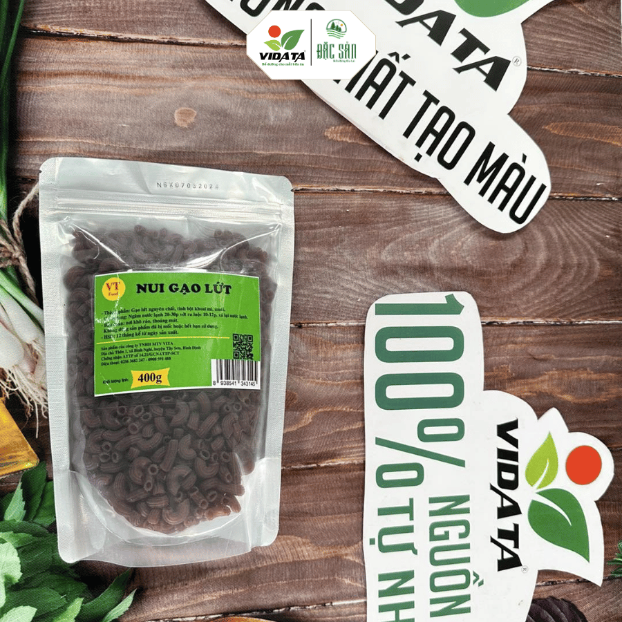 Nui gạo lứt 400g là sản phẩm thực phẩm khô tiện lợi, được làm từ gạo lứt nguyên cám kết hợp tinh bột khoai mì, mang đến nguồn tinh bột lành mạnh, giàu chất xơ và phù hợp với xu hướng ăn uống khoa học – eat clean hiện nay.